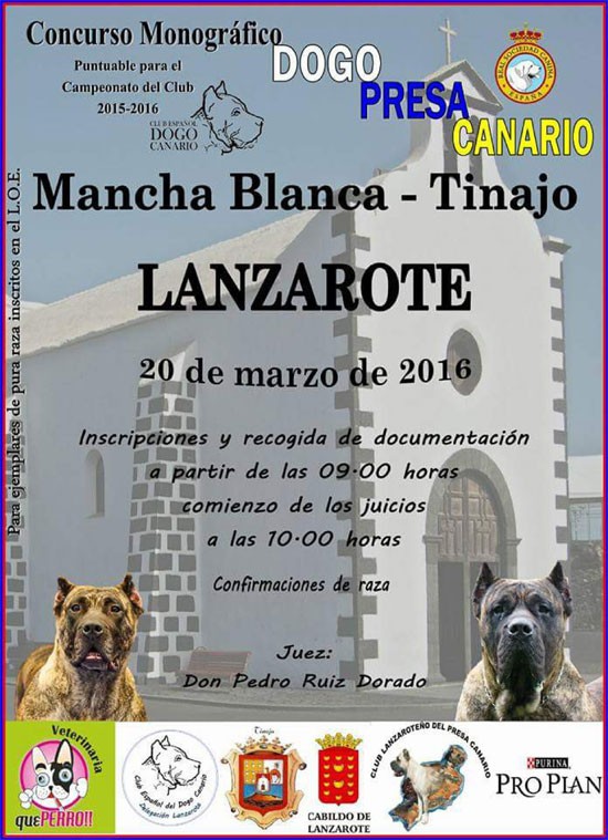El domingo 20 de marzo a las 10 de la mañana, tendrá lugar en el Mercado Agrícola y Artesanal de Mancha Blanca, junto a la iglesia de Los Dolores, el Concurso Puntuable para el Campeonato del Club del DOGO CANARIO. Es puntuable para el Campeonato del Club Español Dogo Canario.