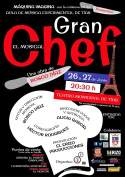 Viernes 26 y sábado 27 Junio a las 20:30 horas Teatro Municipal de Tías Entrada: 10 euros Actividad: GRAN CHEF es un musical sorprendente, de temática culinaria; una tragicomedia al uso, intrigante, con un argumento que va ir creciendo y donde no to...
