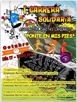 Este sábado 17 de octubre se celebra en explanada Marina Colón la a I Carrera Solidaria Asociación Cáritas Lanzarote "Ponte en mis pies" a las 10:00 horas. El primer circuito será para los niños, con un recorrido de 2 kilómetros. 1000 metros ida y v...