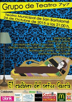 La obra teatral "El cadáver del señor García" se presenta el sábado 24 de octubre a las 21:00 horas en el Teatro Municipal de San Bartolomé. Las entradas pueden adquirirse una hora antes en taquilla, en la Concejalía de Cultura (Casa Ajei), en la Au...