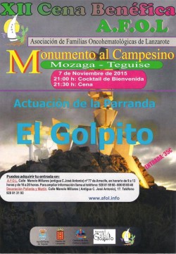 Este 7 de noviembre se realizará la XII Cena Benéfica A.F.O.L (Asociación de Familias Oncohematológicas de Lanzarote). Se efectuará en el Monumento al Campesin, Mozaga-Teguise. A las 21:00 horas será el Cocktail de Bienvenida y a las 21:30 horas, la...