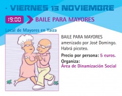 Baile para mayores el viernes, 13 de noviembre a las 19:00 horas en el Local de Mayores en Yaiza. Amenizado por José Domingo. Habrá picoteo. Precio por persona: 5 euros. Organiza: Área de Dinamización Social.