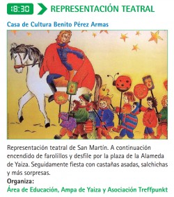 Representación teatral de San Martín el viernes, 13 de noviembre a las 18:30 horas en la Casa de Cultura Benito Pérez Armas. A continuación encendido de farolillos y desfile por la plaza de la Alameda de Yaiza. Seguidamente fiesta con castañas asadas...
