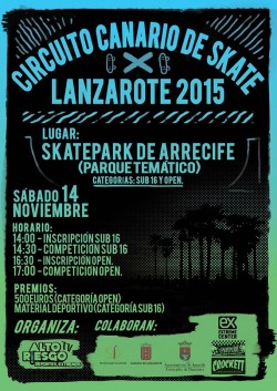 Llega la fecha del "CIRCUITO CANARIO DE SKATE 2015" en Lanzarote. Será el próximo sábado 14 de noviembre en el Skatepark de Arrecife (Parque Temático) Sólo categorías Sub 16 y Open.