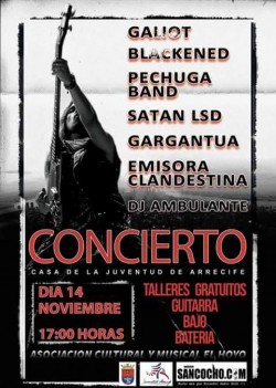Concierto en la Casa de la Juventud de Arrecife el sábado, 14 de noviembre a las 17:00 horas. Con los grupos: Galiot, Blackened, Pechuga Band, Satan LSD, Gargantua, Emisora Clandestina y Dj Ambulante. Habrá talleres gratuitos, guitarra, bajo, batería...