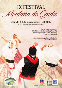 IX Festival Montaña Gaida será el sábado 14 de noviembre a las 20:30, en el Centro Socio Cultural de Mácher, con las actuaciones de: G.F. El Chorro del Farrobillo (Tenerife) A.F. El Despertar de Cedillo (Cáceres) A.F. Gaida de Tías Reconocimien...