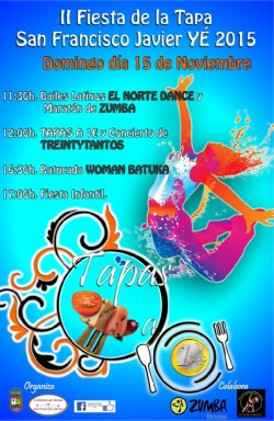 Como parte del programa de las Fiestas en Honor a San Francisco Javier, el domingo 15 de noviembre se celebra la II Fiesta de la Tapa San Francisco Javier YÉ 2015 11:30 horas: Bailes Latinos EL NORTE DANCE y Maratón de Zumba. 12:00 horas: Tapas a 1€...