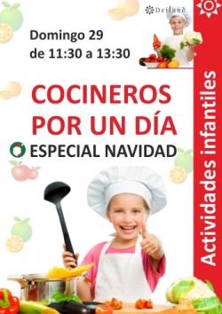 Como parte de las actividades de noviembre del Centro Comercial Deiland, este domingo se realiza el taller "Cocineros por un día" Especial Navidad, para los más pequeños de la casa. Empieza a las 11:30 horas y tiene una duración de 2 horas. Hay 30 pl...
