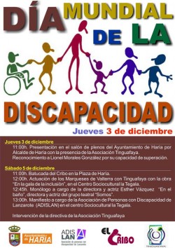 Con motivo del día mundial de la discapacidad este Ayuntamiento de Haría tiene previsto realizar una serie de actos: Jueves 3 de diciembre 11:00h. Presentación en el salón de plenos del Ayuntamiento de Haría por Alcalde de Haría con la prese...