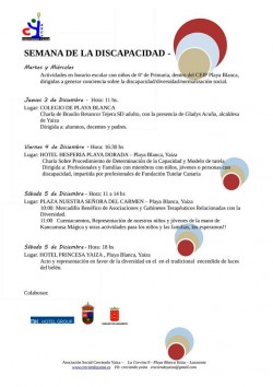 Creciendo Yaiza celebra la Semana de la Discapacidad con un ciclo de charlas informativas El Ayuntamiento colabora en el conjunto de actividades dirigidas a generar conciencia sobre la discapacidad y la diversidad. Yaiza también se vincula a los act...