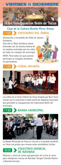 El viernes 11 de diciembre son los Actos de Inauguración Belén de Yaiza. En la Casa de la Cultura Benito Pérez Armas se hará el Encendido del árbol a las 17:00 horas. Decoración y encendido del Árbol de Deseos Solidarios. Este año el Árbol Solidario...