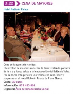 El colectivo de mayores comienza la tarde visitando portales de la isla y luego asiste a la inauguración del Belén de Yaiza. Por la noche está prevista una velada con cena, baile y sorpresas en el Hotel Rubicón Palace de Playa Blanca a las 21:00 hora...