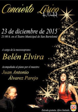 El miércoles 23 de diciembre de 2015 a las 21:00 horas se presenta en el Teatro Municipal de San Bartolomé el Concierto Lírico de Navidad. A cargo de la mezzosoprano: Belén Elvira. Acompañada el piano por el maestro: Juan Antonio Álvarez Parejo. Este...