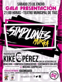 De nuevo, la Murga Los Simplones hará su presentación en el Teatro Municipal de Tías en una gala donde no faltarán las sorpresas, las actuaciones y el humor. Repite como maestro de ceremonias el gran humorista Kike Pérez y que contará con las actuac...