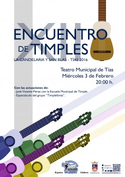 Como parte de la programación de las Fiestas de La Candelaria y San Blas Tías 2016, este miércoles 3 de febrero se celebra el XII Encuentro de Timples, a las 20:00 horas en el Teatro Municipal de Tías. Con las actuaciones de: -José vicente Pérez co...