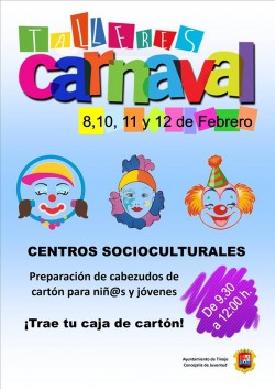 Talleres de Carnaval para niñ@s y jóvenes (8,10, 11 y 12 de febrero). ¡Ya huele a Carnaval en Tinajo! y por ello se han planificado una serie de días de talleres para la elaboración de cabezudos de cartón en los Centros Socioculturales del municipio...