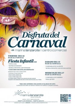 Disfruta del Carnaval en Marina Lanzarote Centro Comercial Viernes día 12 de febrero Desde las 17:00 horas Fiesta Infantil con *Pinta Cara *Muñecos Disneys *Murga Infantil Los Titinijos *Concurso Infantil de disfraces Premios para los clasificados:...