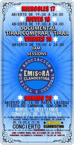 La Asociación musical y cultural Emisora Clandestina presenta un programa para todos los gustos. El miércoles 18 de febrero y jueves 19 de febrero estará abierta hasta la medianoche. El jueves 19, desde las 19:00 horas se presenta el Documental tirar...