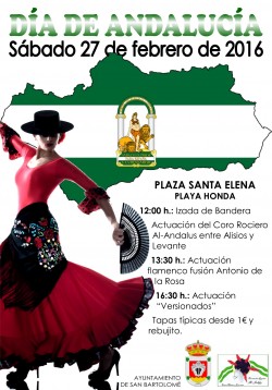 Este sábado 27 de febrero, el ayuntamiento de San Bartolomé presenta una programación por el Día de Andalucía, en Playa Honda. En la Plaza Santa Elena, a las 12:00 horas, se hará la Izada de Bandera, acompañada de la Actuación del Coro Rociero Al-And...
