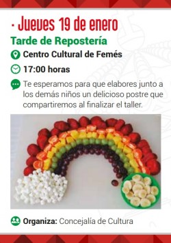 Dentro de su programación de enero, el Ayuntamiento de Yaiza ofrece para este jueves 19 de enero, una "Tarde de Repostería", a las 17:00 horas en el Centro Cultural de Femés, para que los más pequeños elaboren junto a otros niños un delicioso postre que compartirán al finalizar el taller.