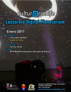 Vuelve Lanzarote Digital Planetarium. La primera actividad para 2017 es este viernes 20 de enero a las 18:00 horas, llamada "Los Cielos del Sur", que se realizará en dos funciones: la primera las 18:00 horas y la segunda a las 19:15 horas, contando con la colaboración del I.P.F.P Marítimo-Pesquero de Canarias en Lanzarote (Escuela de Pesca) para la utilización de la sala del Planetario y las instalaciones del Centro.