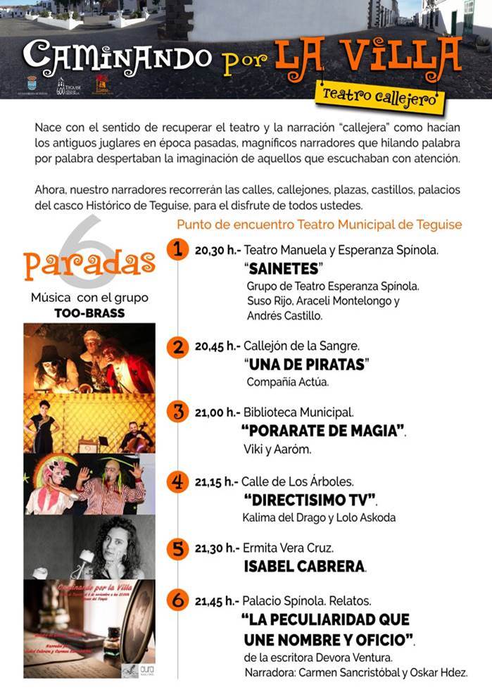 "Caminando por La Villa" (walking through Teguise's village) will take place on November 3rd, with six stops for theatre, music and storytelling in the streets and squares of Teguise, at 8:30 pm.